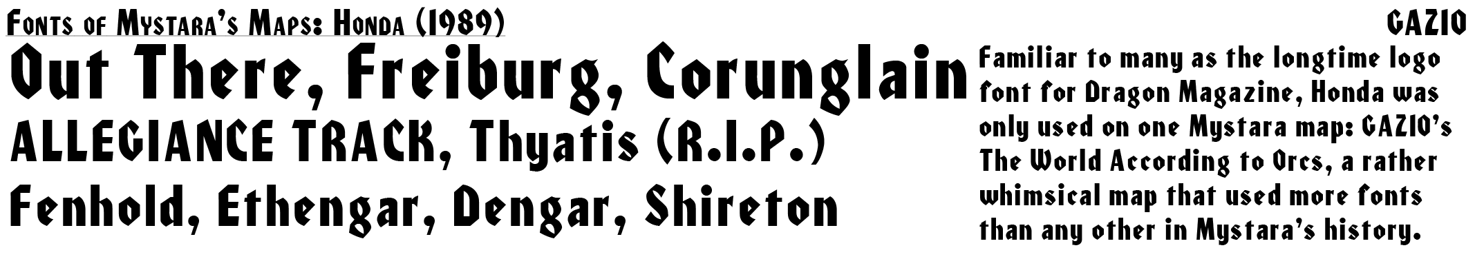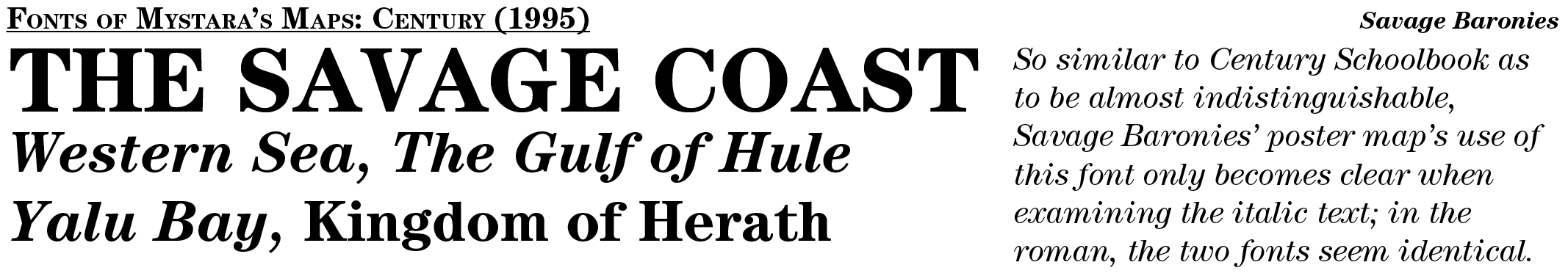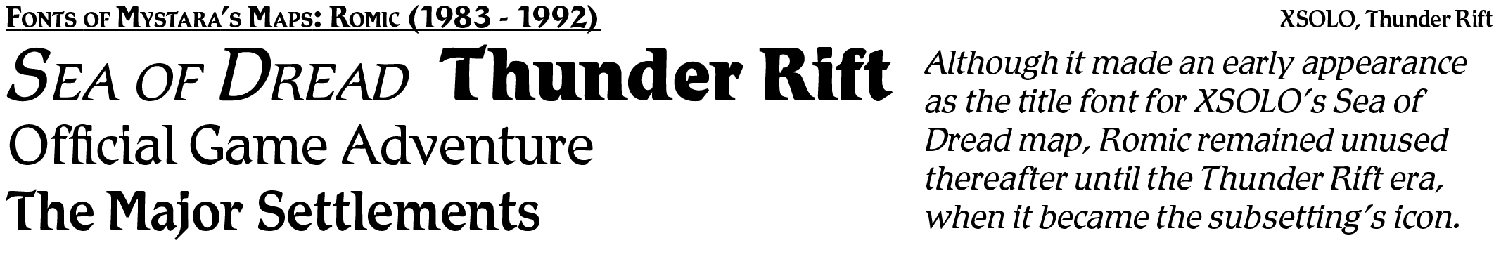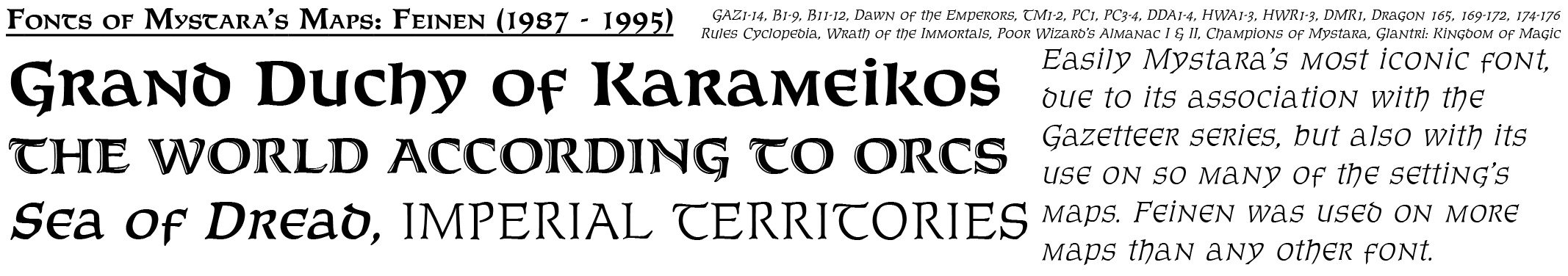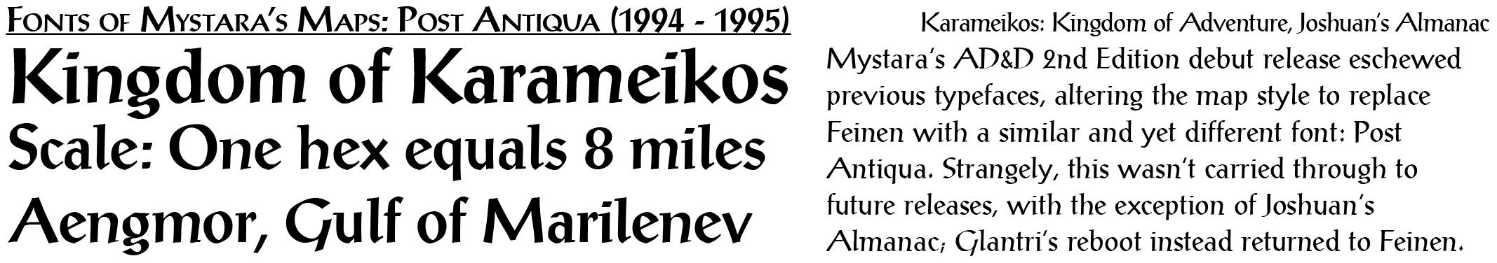 Over the decade and a half and more of Mystara’s official publication, a large selection of fonts were chosen for use in the setting’s maps. This appendix aims to catalogue and present examples of their use, for fun as well as for future reference.