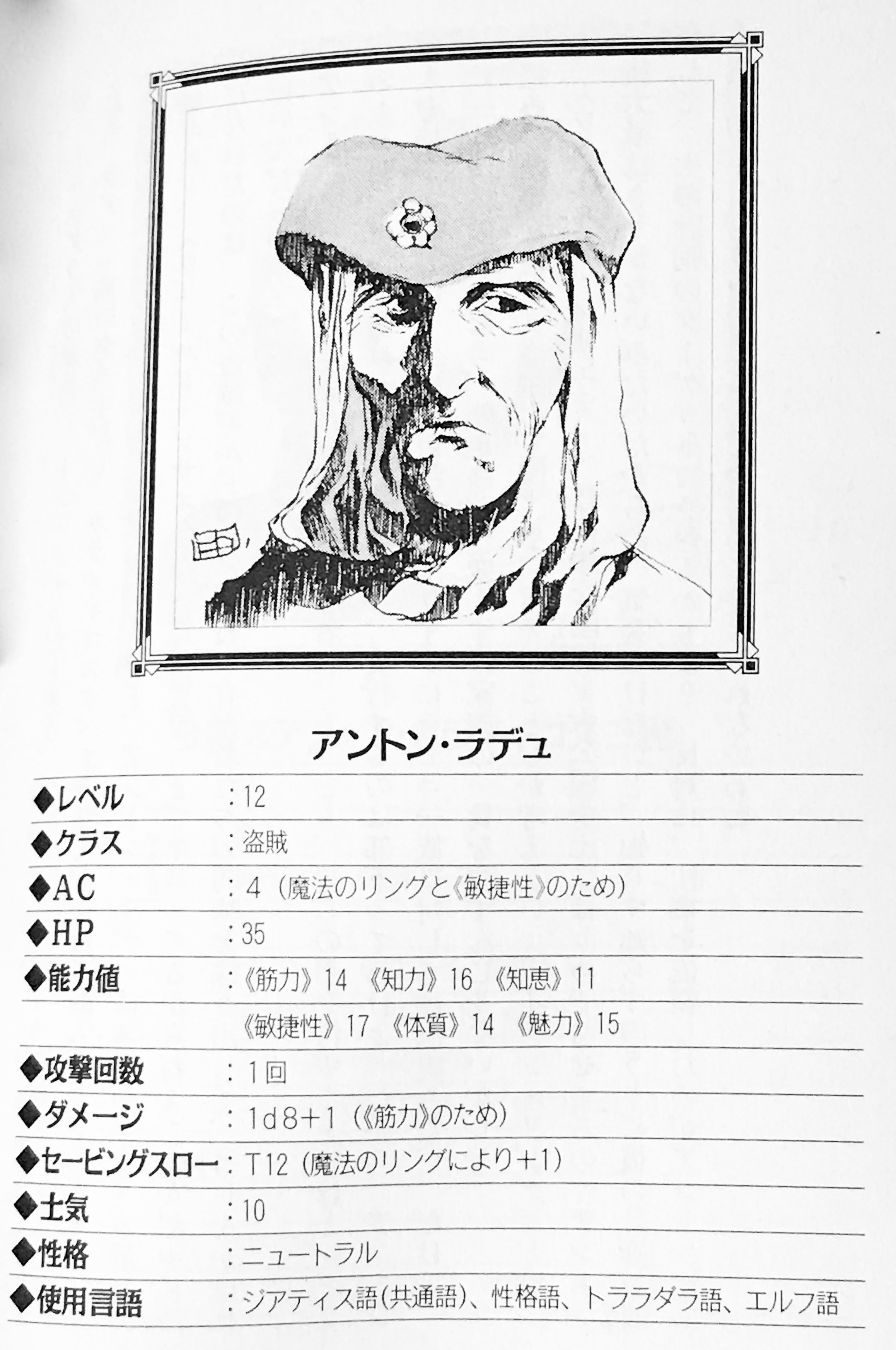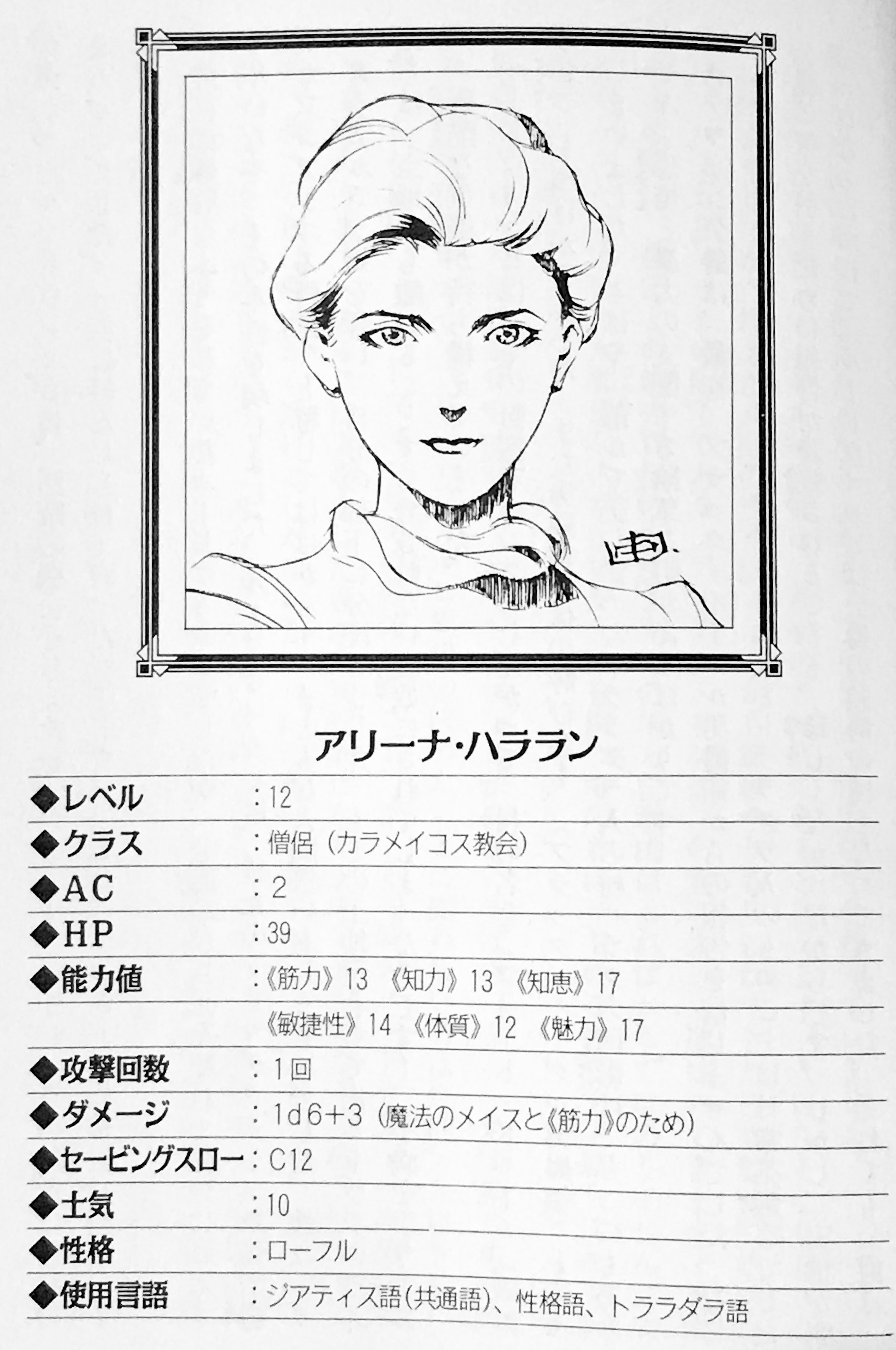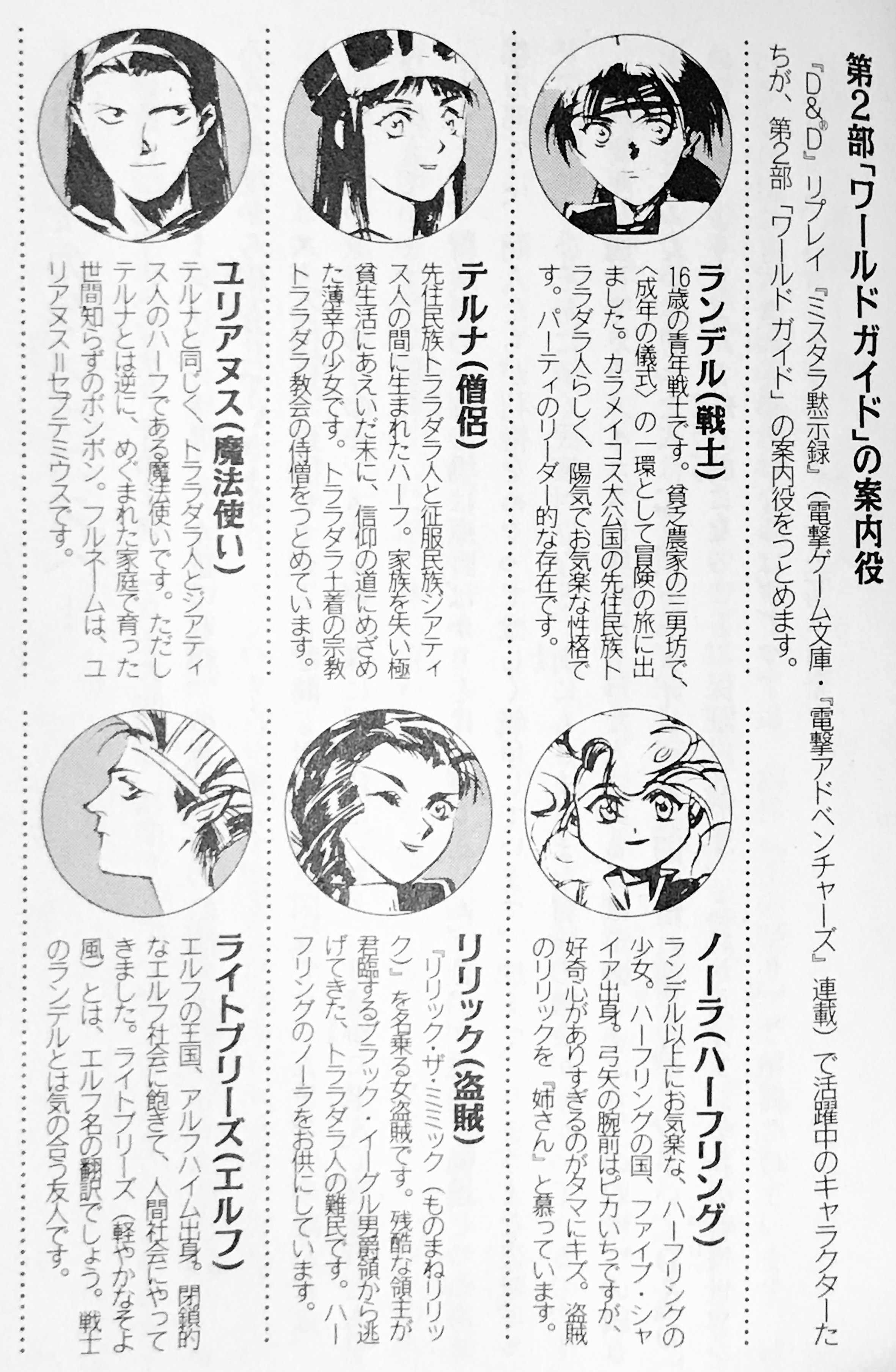 The left-hand panel introduces the “world guides” for the modules. Top row, right to left (Japanese style): Randel (Fighter), Telna (Cleric), Julianus (Magic-User). Bottom row right to left: Nora (Halfling), Lyric (Thief), Lightbreeze (Elf).