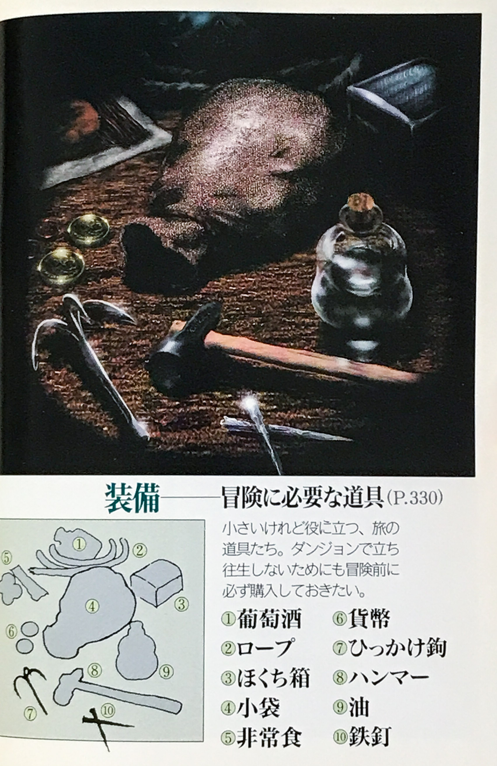 (1) 葡萄酒 Wine, (2) ロープ Rope, (3) ほぐち箱 Tinderbox, (4) Pouch 小袋, (5) 非常食 Rations, (6) 貨幣 Coins, (7) ひっかけ鉤 Grappling hook, (8) ハンマー Hammer, (9) 油 Oil, (10) 鉄釘 Iron spikes
