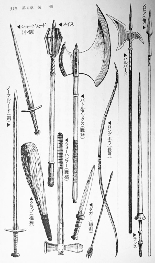 (1) プレートメイル Plate mail, (2) チェインメイル Chain mail, (3) バトルアックス (戦斧) Battle axe, (4) ノーマルソード (剣) Normal sword, (5) スリング Sling, (6) クラブ (棍棒) Club, (7) ロングボウ (長弓) Longbow, (8) ダガー (短剣) Dagger, (9) スタッフ (杖) Staff, (10) スピア (槍) Spear.