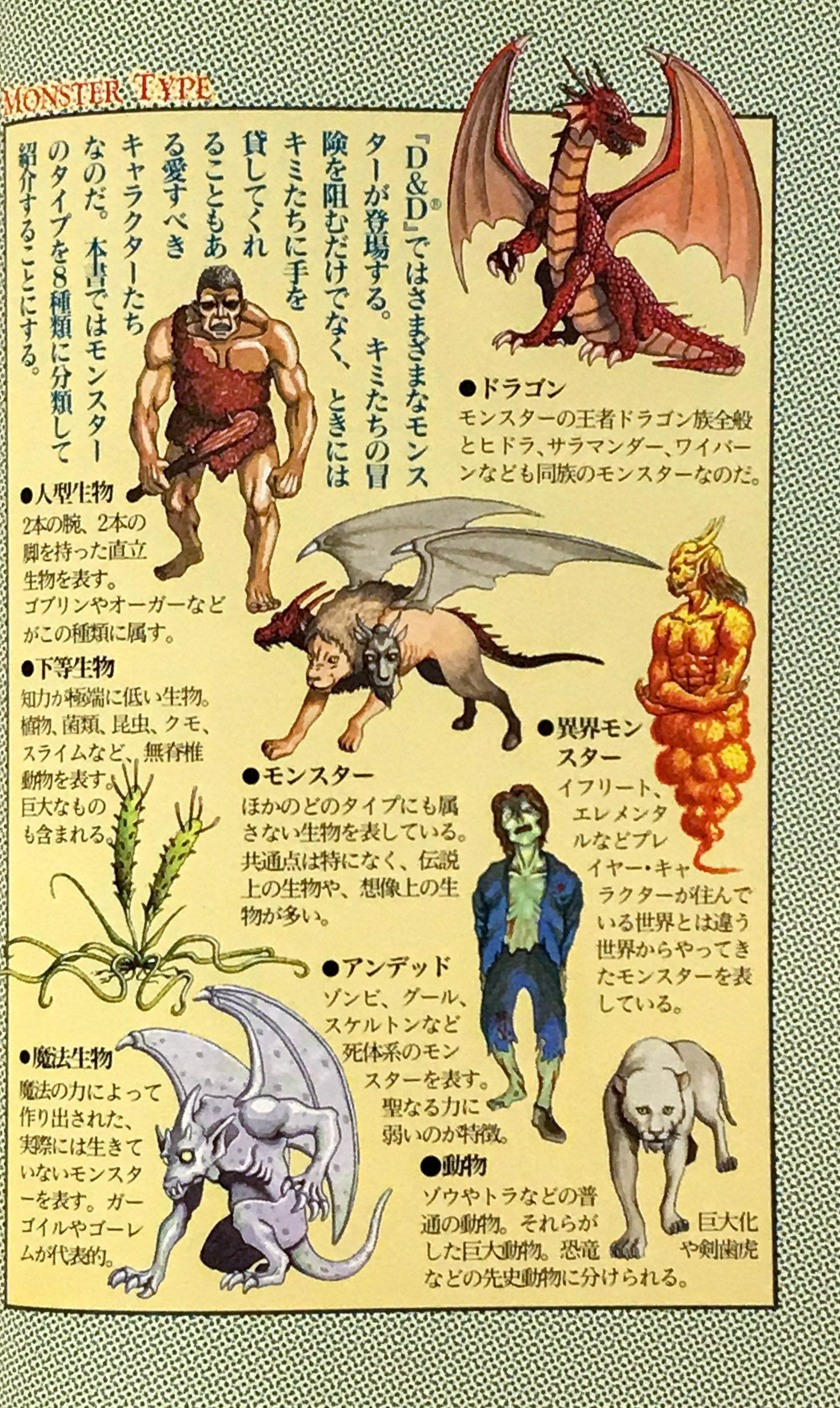 The last panel shows monster types, dividing them into humanoids, lowlife (spiders, slimes, etc.), dragons, general monsters, other-planar monsters, magical constructs, undead and animals.