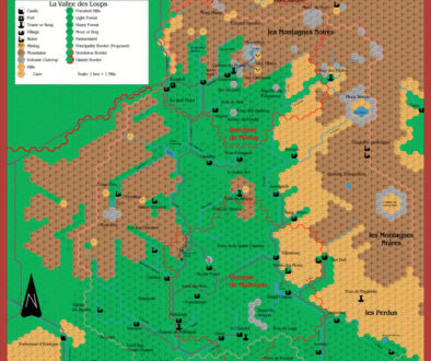 This is a combined version of B10’s pair of 2 mile per hex maps of the Foamfire Valley and the Lost Valley. Not only that, it also folds in the mountains from the Eastern Karameikos map, which have been used to fill out the corners of the map.