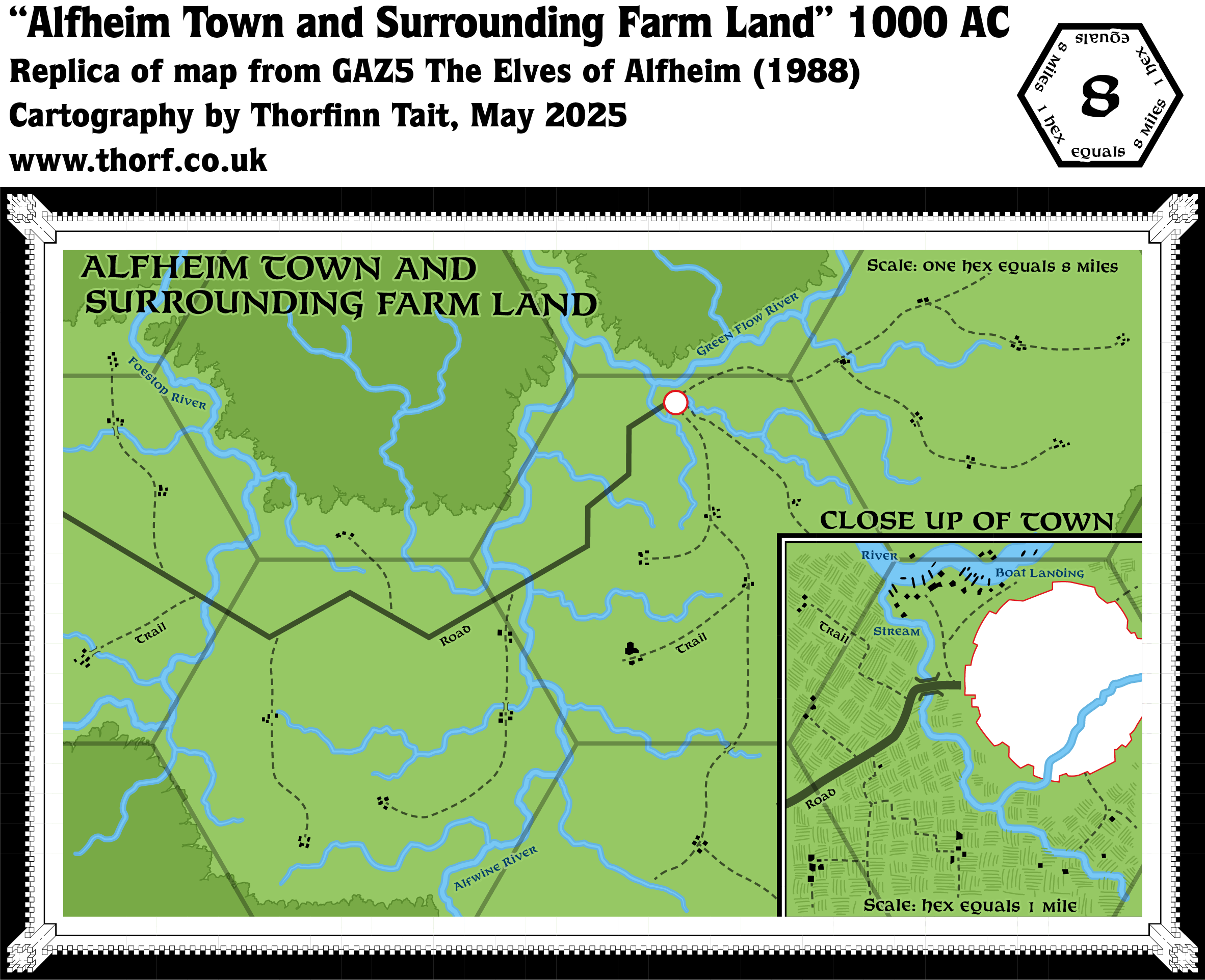 This was a peculiar map, as although it was nominally 8 miles per hex, in fact the detail was more in line with a much larger scale such as 1 mile per hex. The 8 mile hexes were printed very large, so that it would be easy to overlay it with a more appropriate scale for the resolution. It also included a close-up that was nominally 1 mile per hex but with the exact same scaling issues as the main map. The close-up would surely be more appropriate as a 1/8 mile per hex map, with a corresponding hex grid.