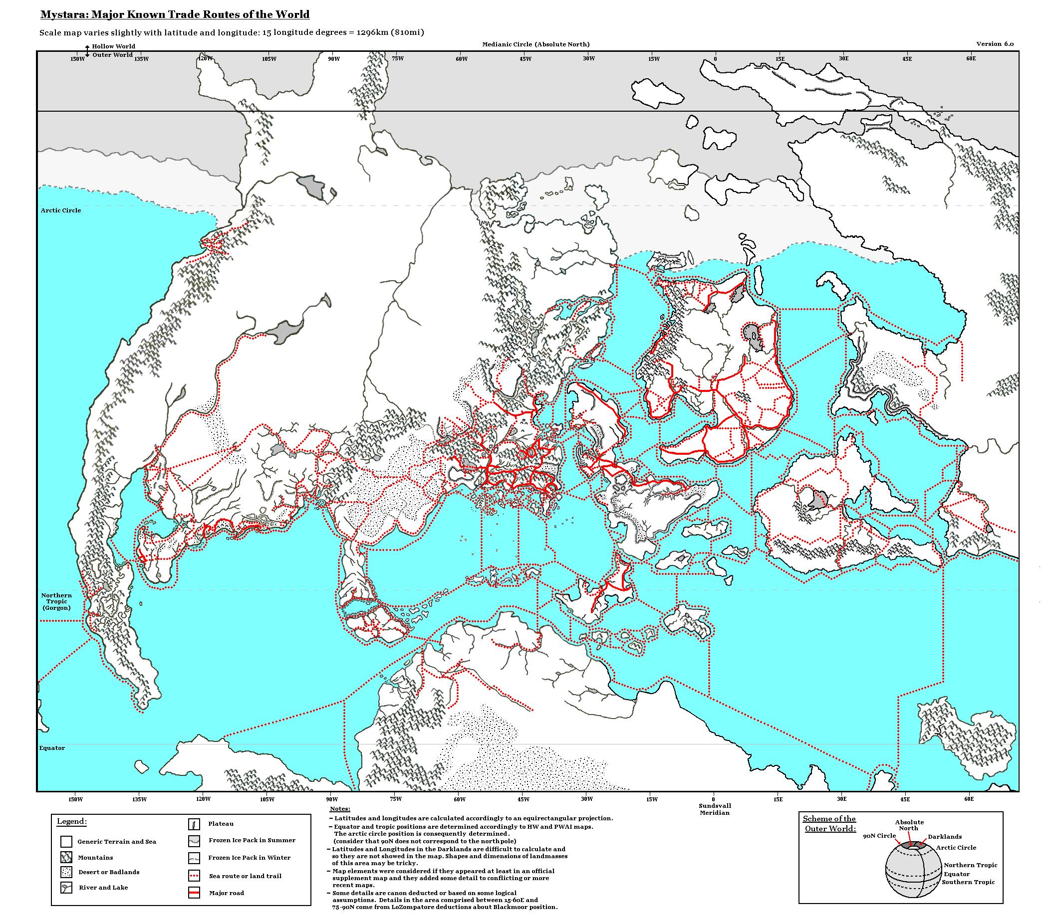 The second map is a little bit more refined than the map above: among the modifications I made I extended the interrupted sea routes to faraway lands (Cestia, the Jungle Coast and possibly the western coast of Davania and Izonda). I also completed a couple of routes around some of the Alatians and the Pearl Islands.