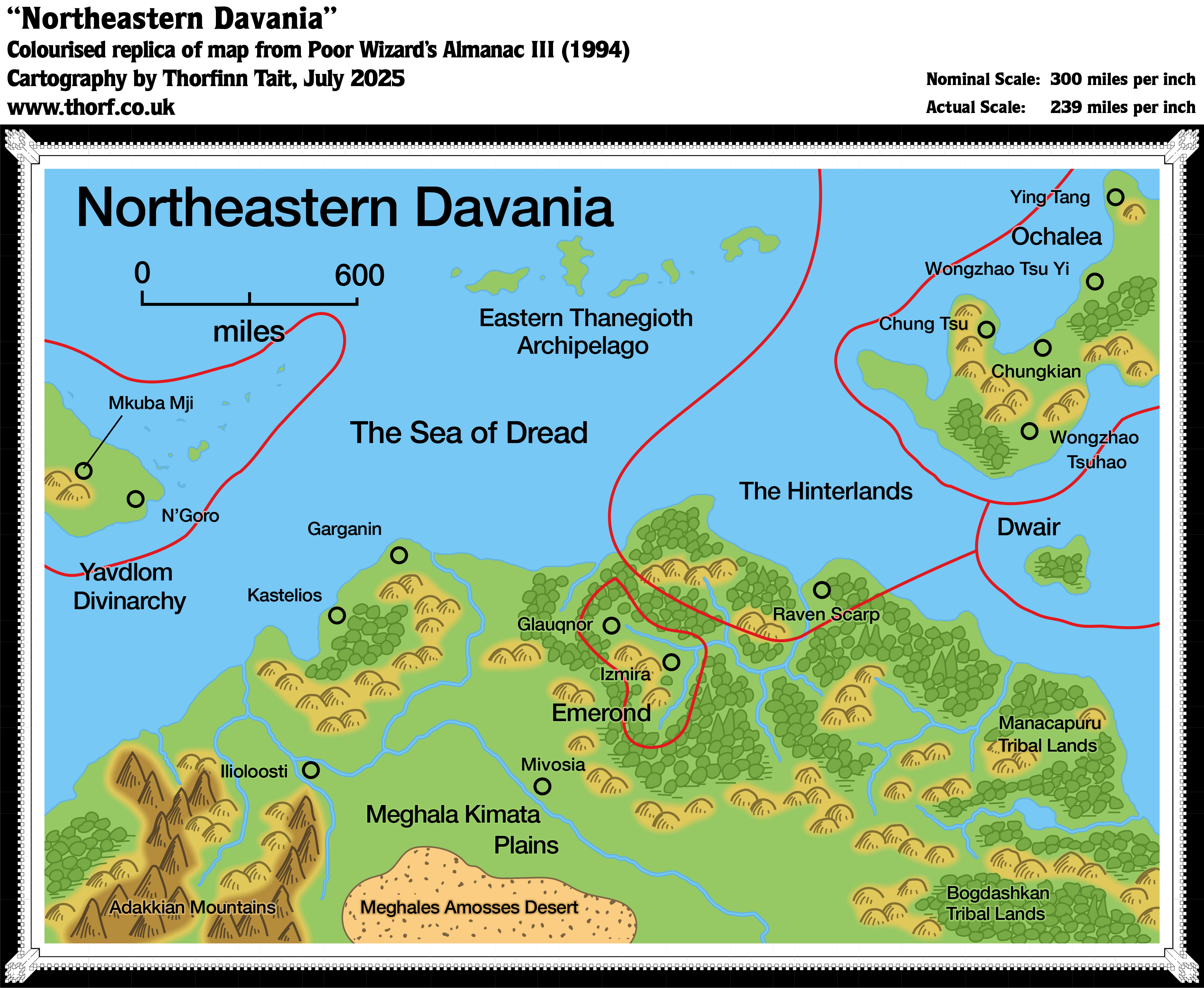 The poster map in Poor Wizard’s Almanac II featured the Sea of Dread Region at 72 miles per hex. This map appeared in Almanac III the next year, and it presented the same section of northeastern Davania in the art style of the Almanac maps. The area covered was rather large for the small printed area, and consequently the map didn’t include anything in the way of new details.