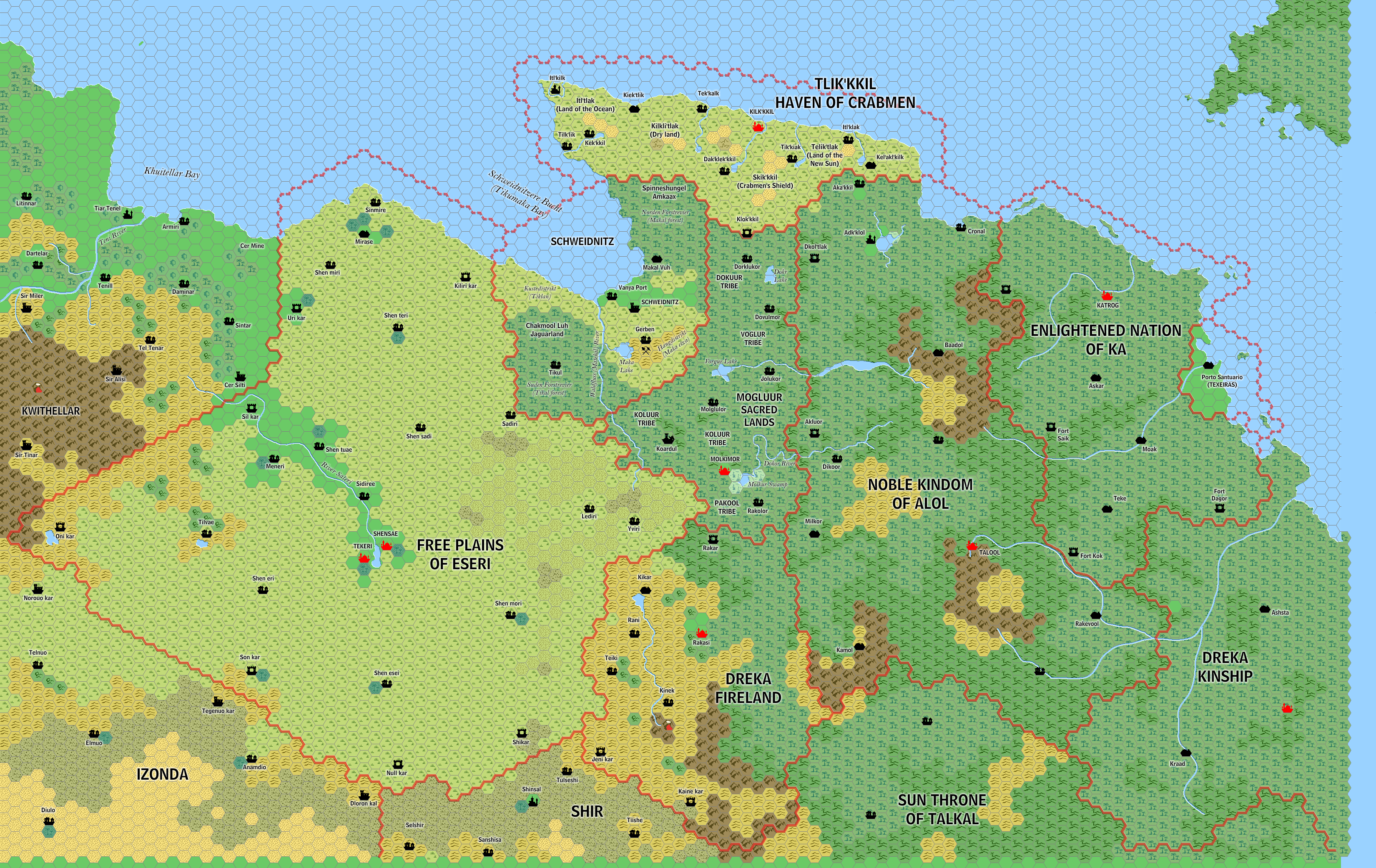 By February 2017, he had completed first Eseri, then the whole block of nations east of it, up to the Adakkian Sound. The third map below shows the first step, Jose’s conversion of Francesco’s original maps. In the second map below, Jose completed Dreka Fireland and Alol, then added in Ka, Dreka Kinship, and Talkal. He converted these from Francesco’s 24 mile per hex map, with minimal additions. This was the first map of these nations at 8 miles per hex.