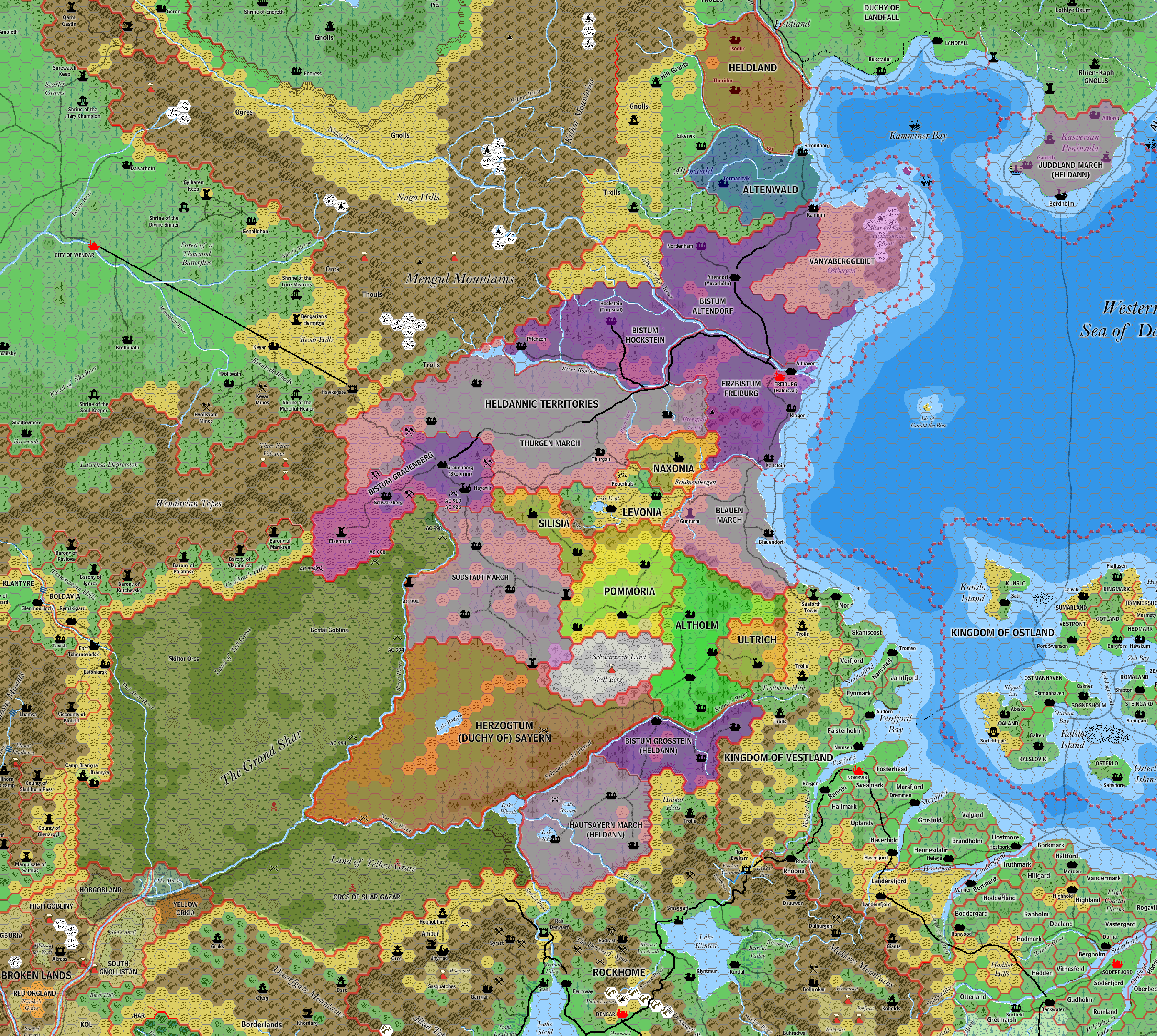 This is a fan-made map. It was published in April 2016. The updated Atlas version of this map is Heldann, 8 miles per hex. See also Appendix C for annual chronological snapshots of the area. For the full context of this map in Mystara’s publication history, see the upcoming Let’s Map Mystara 2016.